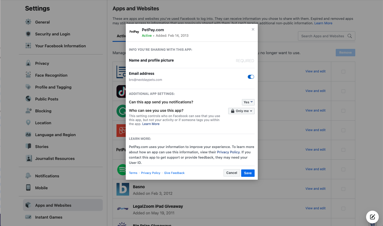 Congratulations! You have successfully removed the PetPay app from your Facebook account. If you have any other questions or requests, please email us at support@petpay.com.